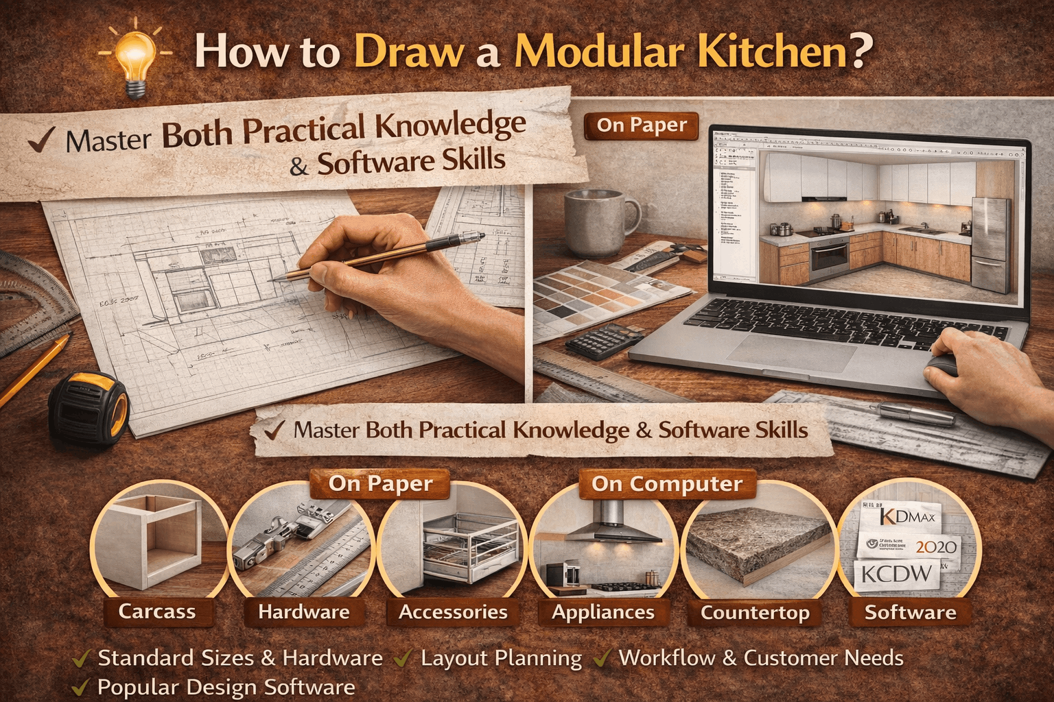 Software tools help visualize ideas, but strong modular kitchen knowledge is what truly makes a professional designer successful. Whether you draw on paper or computer, mastery comes from understanding kitchen planning fundamentals.