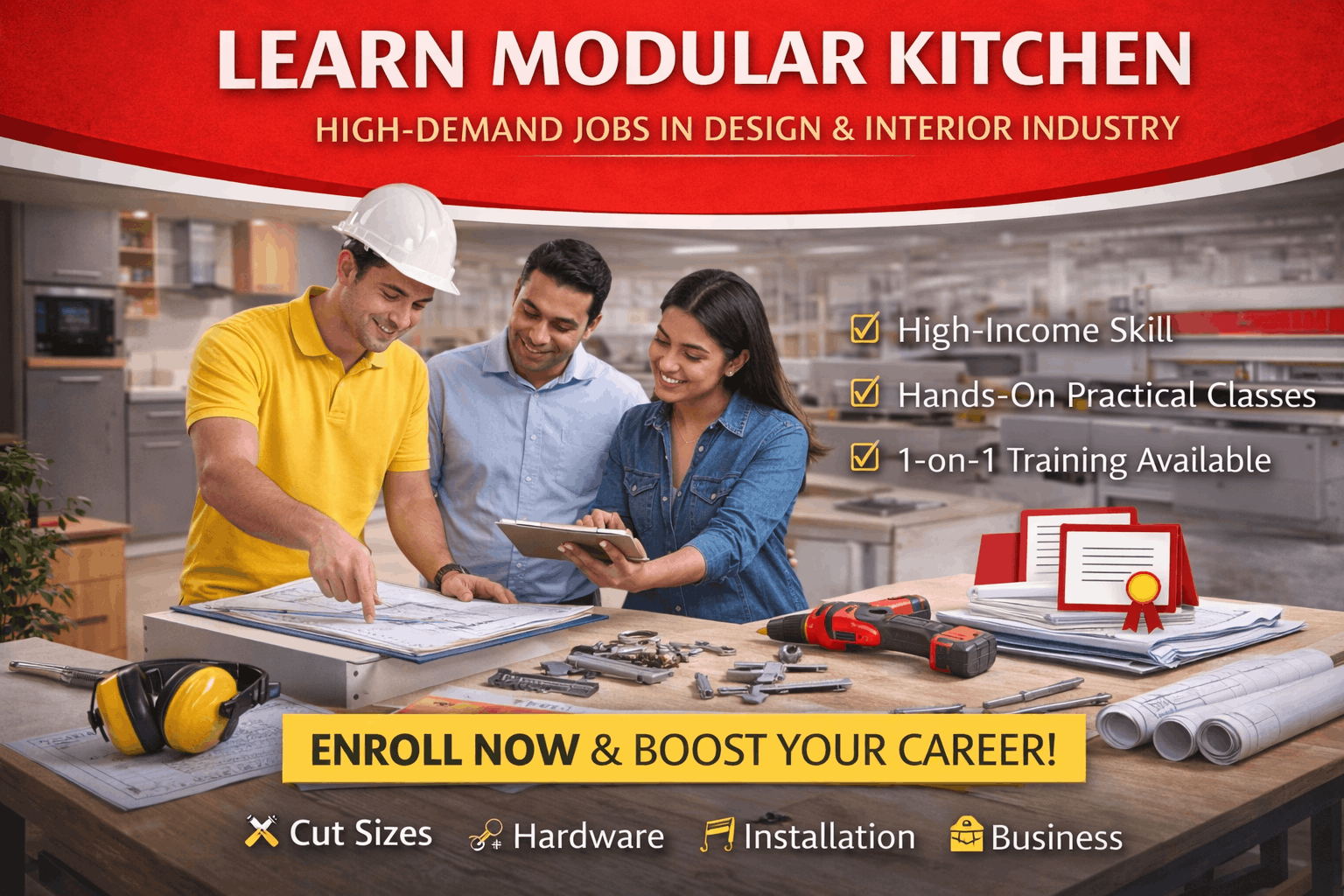 A Diploma in Modular Kitchen level training builds your confidence and gives you the technical clarity that most beginners miss. It teaches you the real market working style and prepares you for actual site challenges.